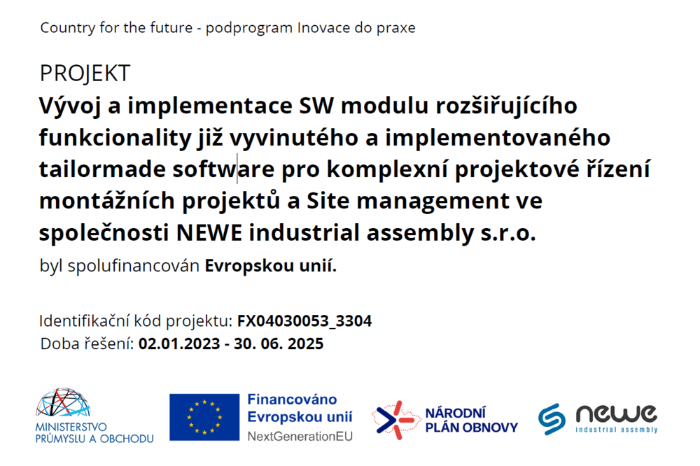 S radostí oznamujeme úspěšné dokončení projektu, který byl spolufinancován Evropskou unií a zaměřen na vývoj a implementaci softwarového modulu rozšiřujícího funkcionalitu našeho interního systému pro komplexní projektové řízení montážních projektů a site management v naší společnosti. Projekt byl realizován za účelem digitalizace a dalšího zefektivnění řízení montáží, plánování zdrojů, koordinace týmů a sledování průběhu projektů v reálném čase. Díky tomuto rozšíření jsme výrazně zvýšili míru automatizace, přehlednost procesů a schopnost operativně reagovat na změny v rámci montážních projektů. Projekt byl úspěšně dokončen dne 30. 6. 2025. Díky tomuto projektu jsme mohli posílit naši digitální infrastrukturu a nadále můžeme posouvat úroveň řízení projektů v oblasti montážních systémů a průmyslových instalací.